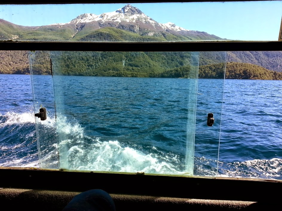 um confortável barco, que navega pelo lago Menedez, com 350 metros de