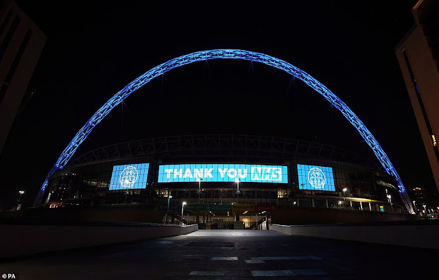 Os principais cartões-postais de Londres, como a roda-gigante London Eye, o Arco de Wembley (foto) e a Tower Bridge foram iluminados de azul, o símbolo do NHS.