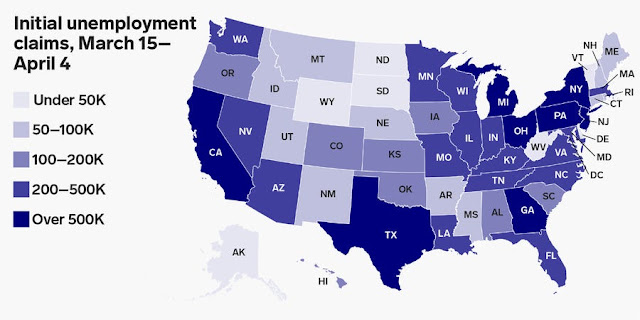 Este mapa mostra o número acumulado de reivindicações para cada estado nas três últimas liberações do seguro desemprego, entre 15 de março e 4 de abril.