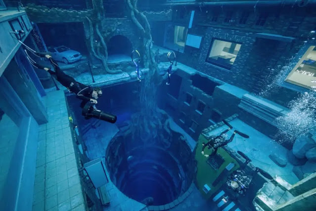 A piscina do Deep Dive Dubai tem várias atrações subaquáticas, incluindo uma cidade submersa que lembra uma cidade abandonada, apartamento, garagem e fliperama.