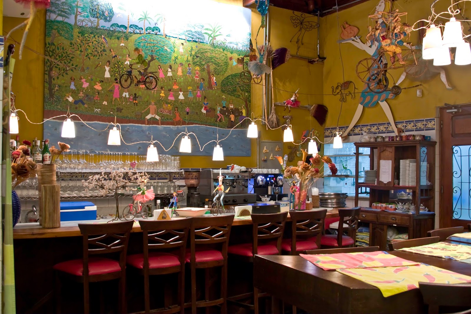 viagem gastronômica, visual e muito lúdica. São mais de duas décadas de sucesso, boa comida, mesas concorridas com gente descolada, uma decoração inusitada e muito colorida, que inclui fadas, equilibristas e pierrôs flutuando no teto, entre outros badulaques, todos de muito bom gosto.