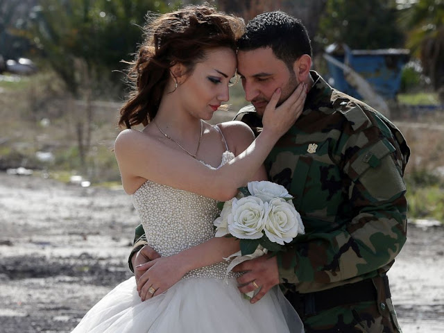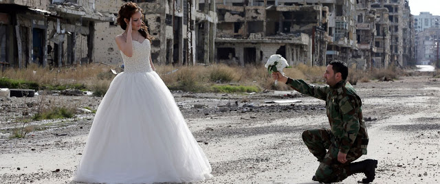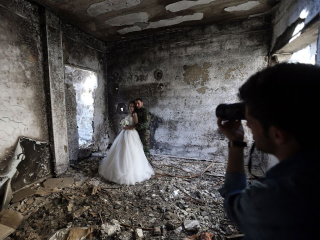 Seria mais uma sessão de fotos para um álbum de casamento se o cenário não fosse a Síria, país totalmente devastado pela guerra.