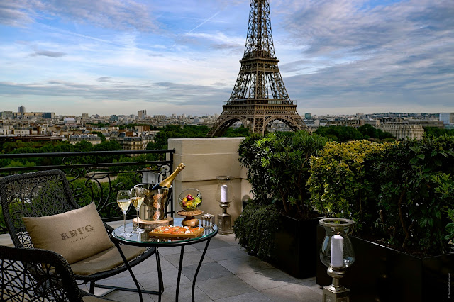 O Shangri-La Hotel Paris, um dos cinco estrelas mais bem localizados da cidade, está abrindo o seu Terraço de Verão para drinks no final da tarde com o champagne vintage da marca Krug, que podem ser acompanhados de canapés salmão, caviar e presunto Bellota.