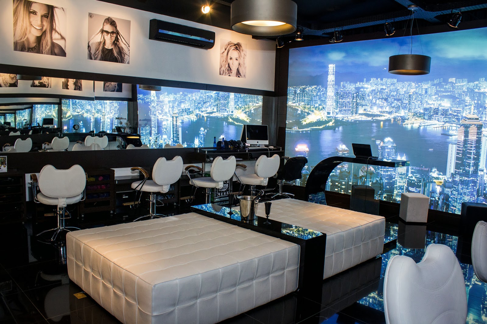 de Hong Kong ao fundo, grandes painéis recheados de loiras, iluminação cênica (indireta), comidinhas sofisticadas, vários ambientes, garçom, drinks, som ambiente, que incluem até apresentações de DJs ou músicos tocando jazz, o studio foi idealizado para que as clientes possam ficar ali muitas horas até atingirem o tom perfeito, aquele bem platinado, estilo top model.