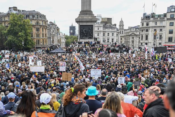 Muitos pediam o fim da “tirania” relacionada ao lockdown, expressando ainda suas opiniões contrárias às vacinas e à pedofilia.