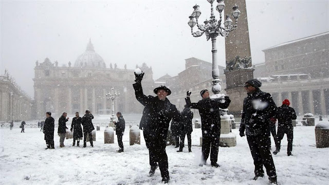 Não nevava assim em Roma desde 2012. Com saudade da capital tingida de branco, os moradores estão fazendo a festa, inundando de fotos e vídeos as mídias sociais. Nápoles também teve uma grande nevasca.