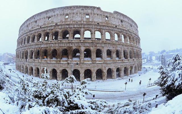 As inúmeras nevascas da madrugada derrubaram a temperatura para até 20º negativos, trouxeram inúmeros ao transporte, aeroportos fechados e voos cancelados, mas tingiram de branco os principais monumentos da cidade, como o Coliseu e a Fontana di Trevi.