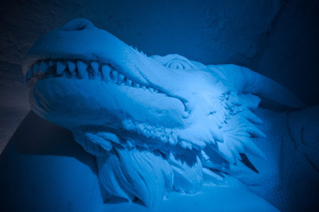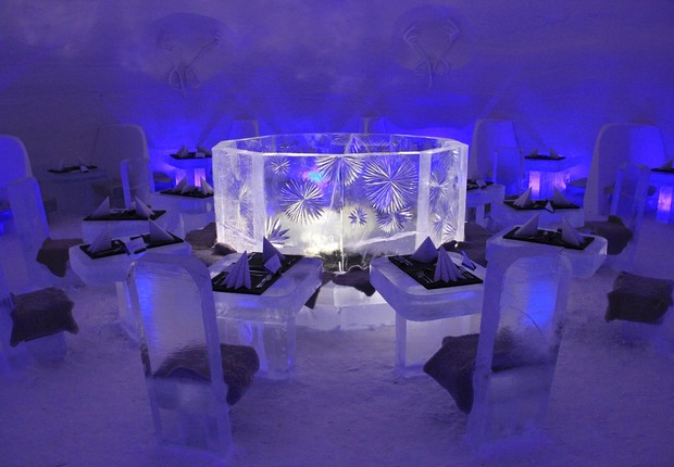 Na decoração há ainda um trono, um Hall of Faces e várias esculturas gigantes de dragões de gelo, além de ice bar, ice restaurante e uma capela – tudo de gelo, é claro!