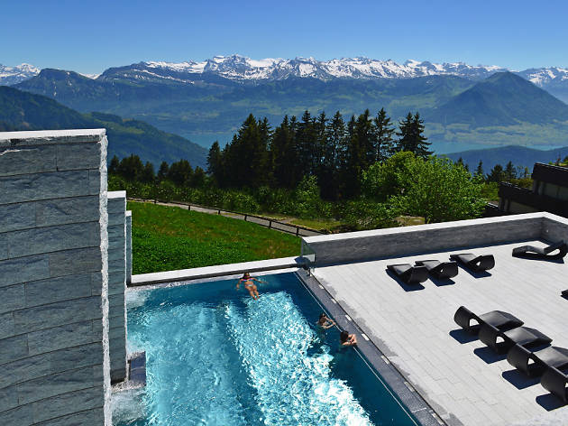 Essa experiência é oferecida pelo Mineraldbad & Spa Rigi Kaltbad, a 1.450 m do nível do mar, em Weggis, na região de Lucerna. O projeto leva a assinatura do renomado arquiteto suíço Mario Botta e o resort de luxo fica na praça Giardino Minerale, também projetada por ele.