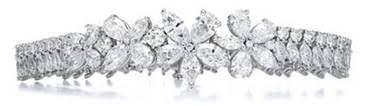 | Bracelete em platina com diamantes custa US$ 130 mil e os brincos, US$ 115 mil |