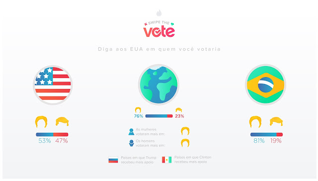 Nos Estados Unidos, 53% votariam em Hillary Clinton e 47%, em Trump. Já no Brasil, 81% dos usuários do app também