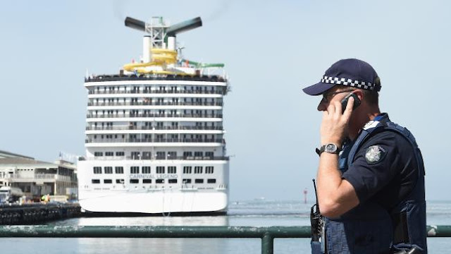 | Passageiros sendo retirados do navio pela polícia Foto Harold Sun/Reprodução |