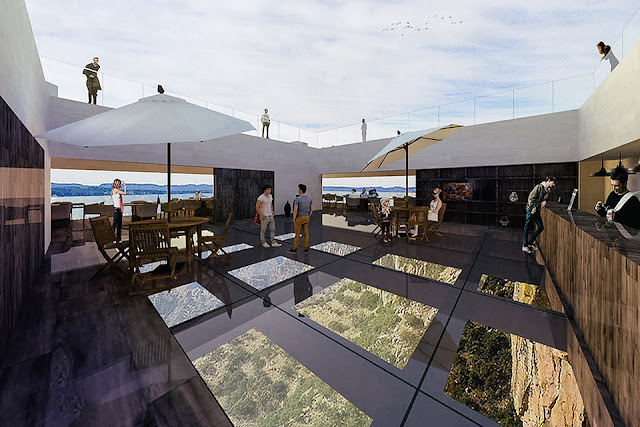 No outro, vai funcionar o restaurante, com mesas ao longo da murada. Tem ainda uma piscina, de fundo transparente, para dar a sensação de estar flutuando sobre as montanhas com vista para a bela queda d´água.