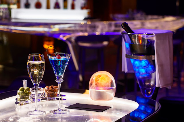 Além disso, o bar é uma atração à parte. O espaço está sob uma instalação azul, semelhante a um céu noturno, de ondas irregulares de tecido que escondem o teto.