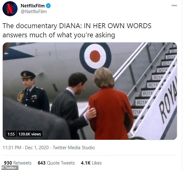 Na conta da Netflix Film, foi promovido o documentário In Her Words, baseado em fitas de áudio que Diana fez secretamente para o biógrafo Andrew Morton.