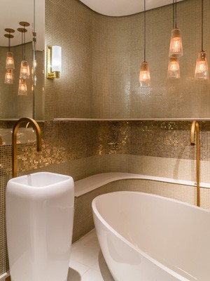 estilosa: luminárias de design, paredes revestidas com pastilhas, espelhos
