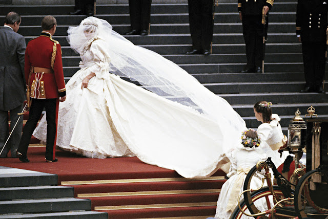Como uma verdadeira princesa, a jovem Diana quase cobriu as escadarias da Catedral St Paul com o vestido, que tinha 7 metros e 72 cm de cauda.
