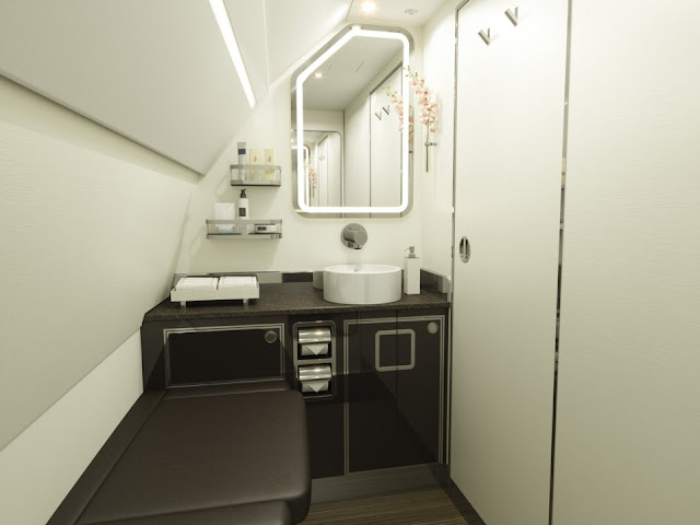 O avião também terá dois banheiros, projetados para o passageiro se sentir num hotel. Cada um deles tem um espelho de corpo inteiro e banco. O da tripulação é bem menor.